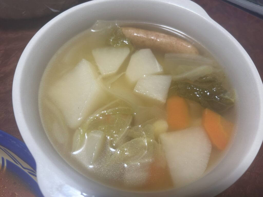 ・白菜、ニンジン、じゃがいも、玉ねぎの野菜とコンソメをいれて圧力鍋で煮るだけ